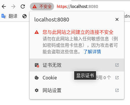 cert-key: /home/userName/.ssl/cert-key.key此时访问localhost将依然报错,因为没有为浏览器安装颁发者的证书