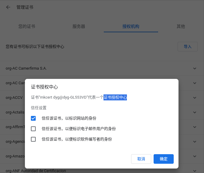 # └── rootCA.pem 颁发者机构的证书然后将上述颁发者mkcert机构证书文件rootCA.pem手动添加到pc端的浏览器中