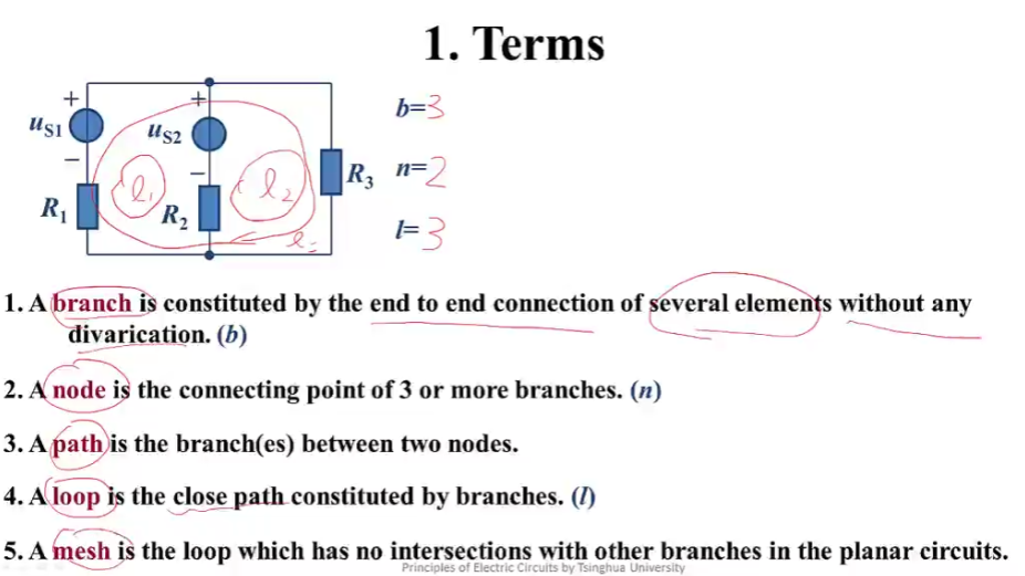 - 回路:回路 是 闭合的路径,由支路组成