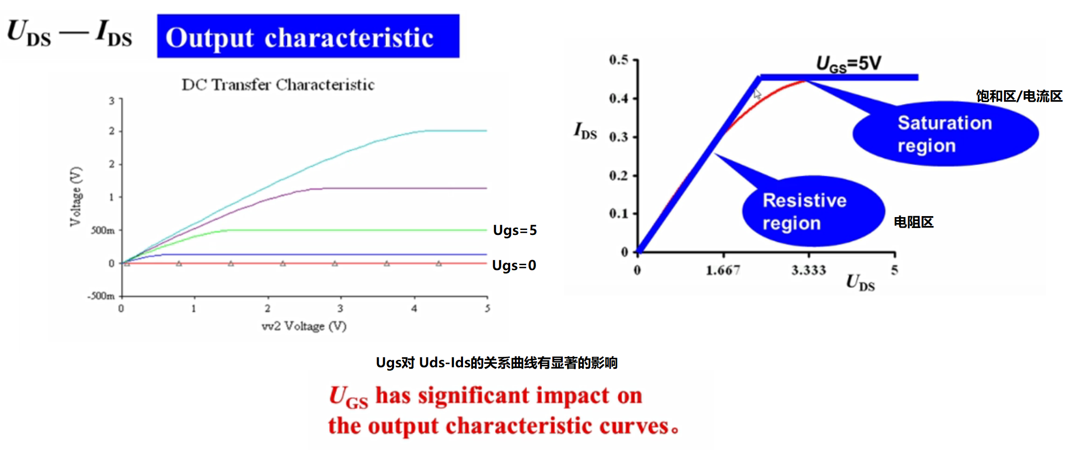 - 且由于这里的Uds没有改变,所以电阻R=u/i也就小了,实际上也就是在通过Ugs控制DS间的电阻。