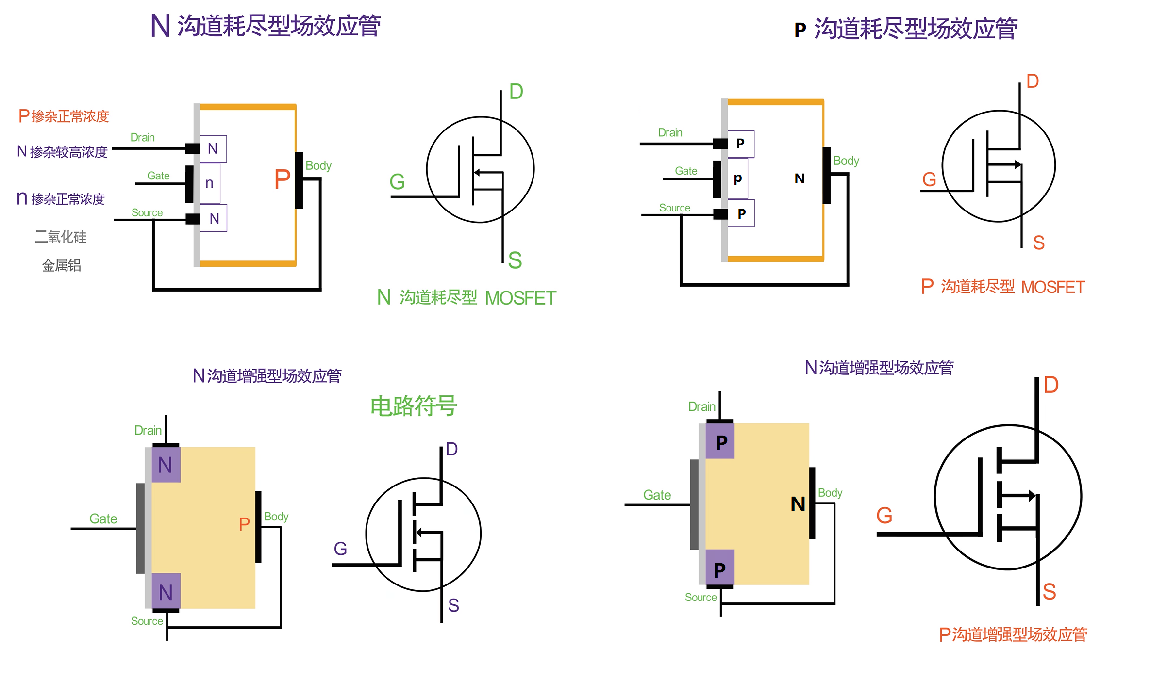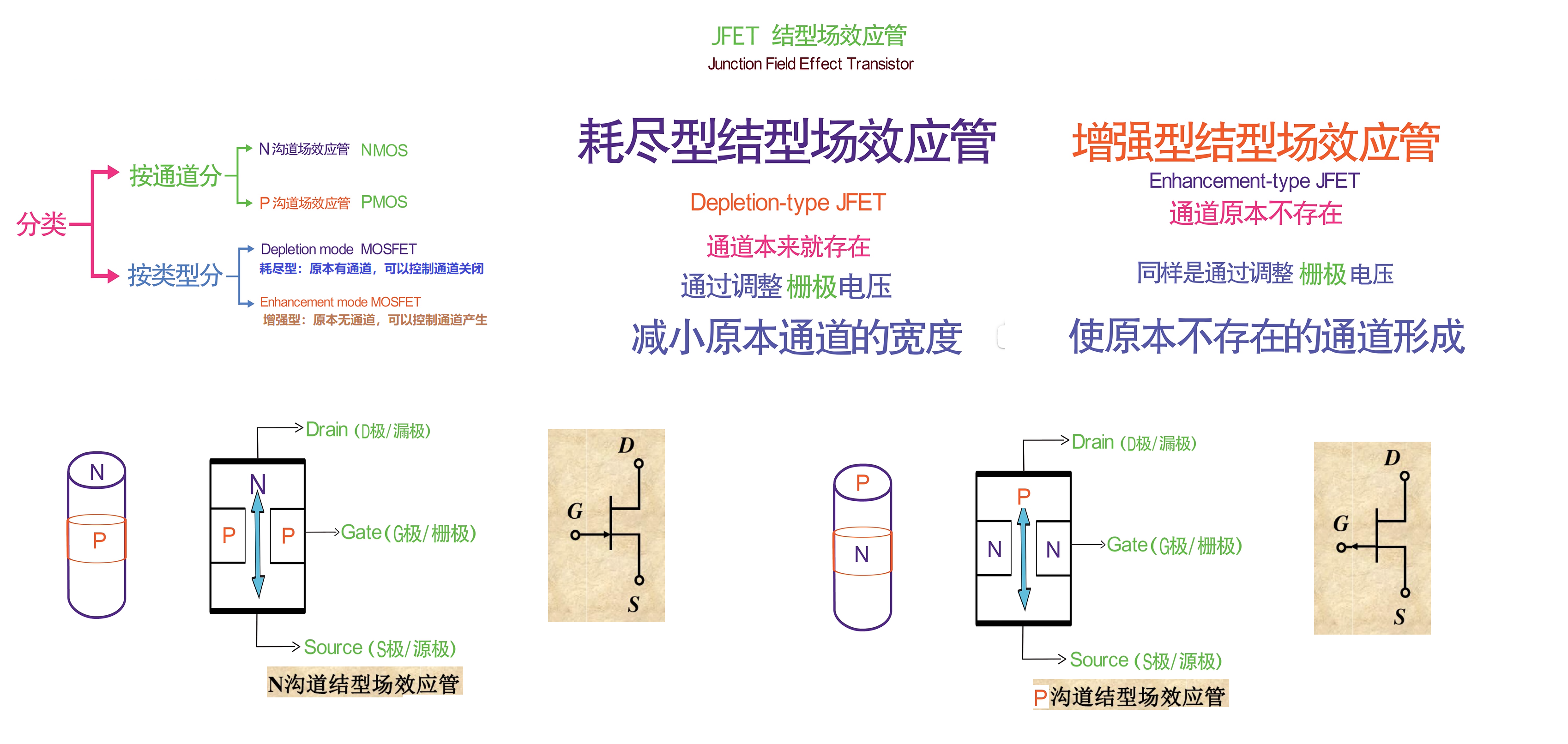 - 在耗尽型场效应管中,Ugs上的电压(反向电压)将使得栅极和基座间的电场建立,导电沟道中的电荷被排斥,于是导电沟道变窄,Uds的电压将使得导电沟道因为体二极管反向偏置而变窄,这两个电压将因电场的均匀分布而共同作用于其内的导电沟道,Ut描述了这种平衡关系