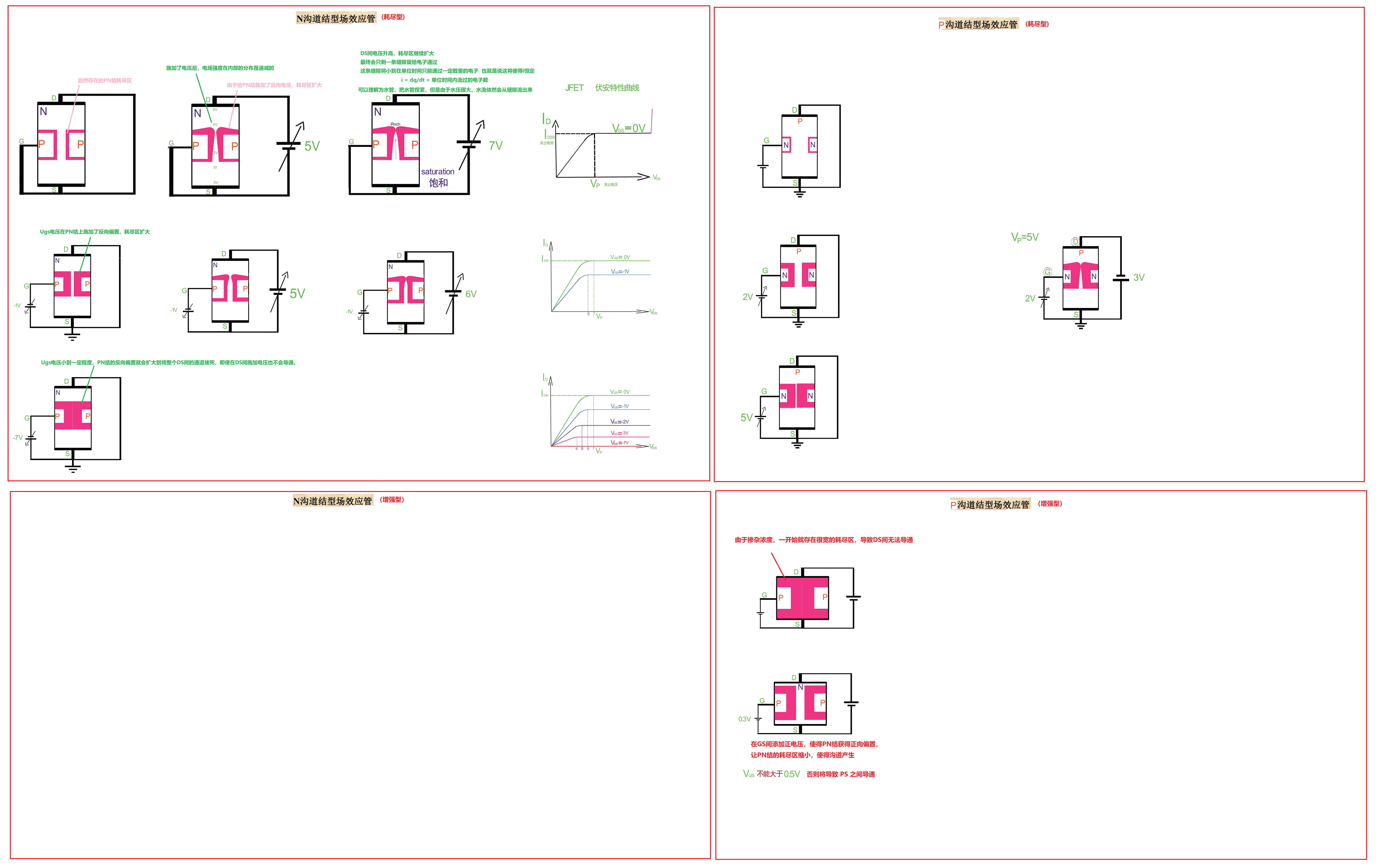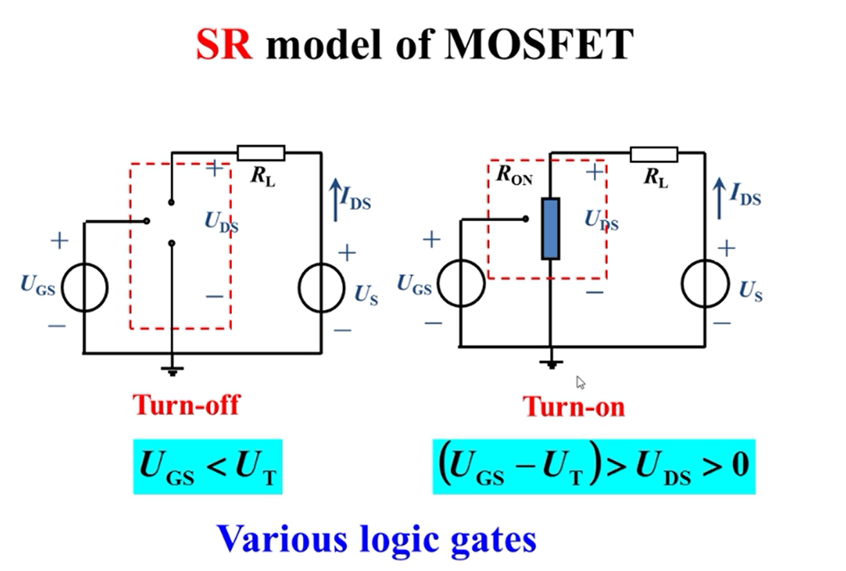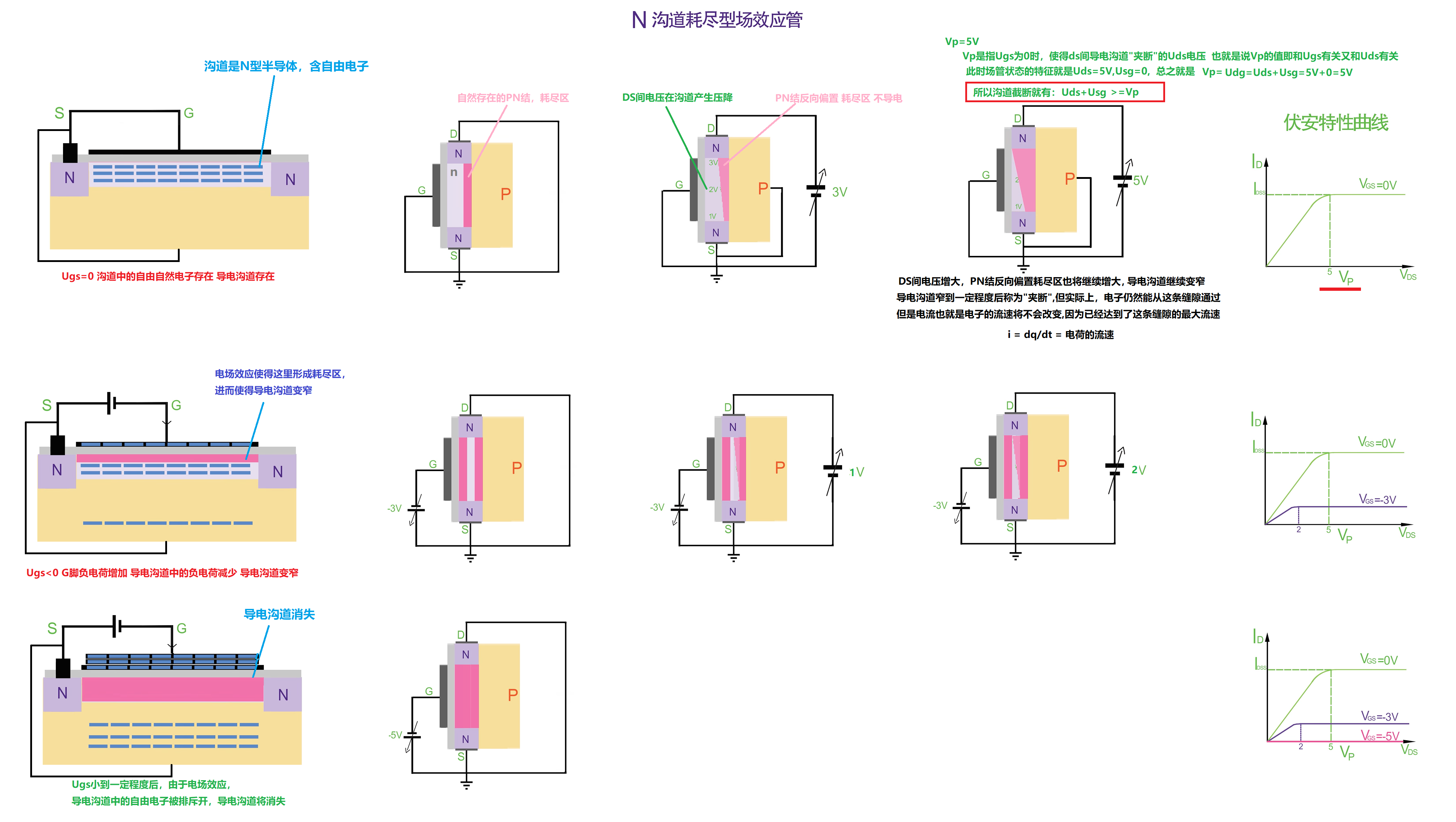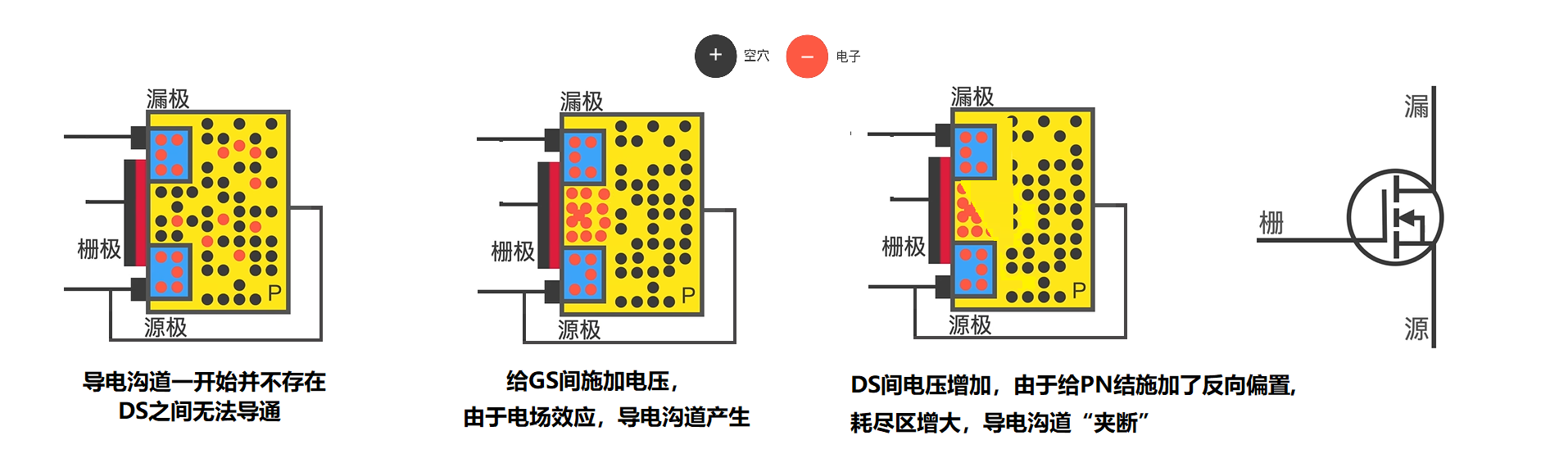 - 当达到Ugs>=Uds+Ut时,栅极和基座间的等效电容电压>=Ut,DS间的导电沟道因电场效应而导致宽度>=0