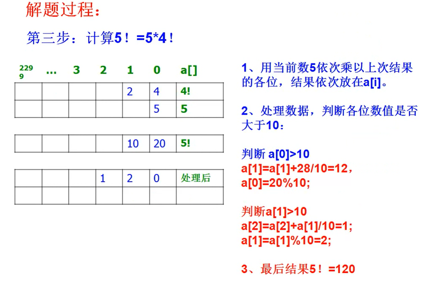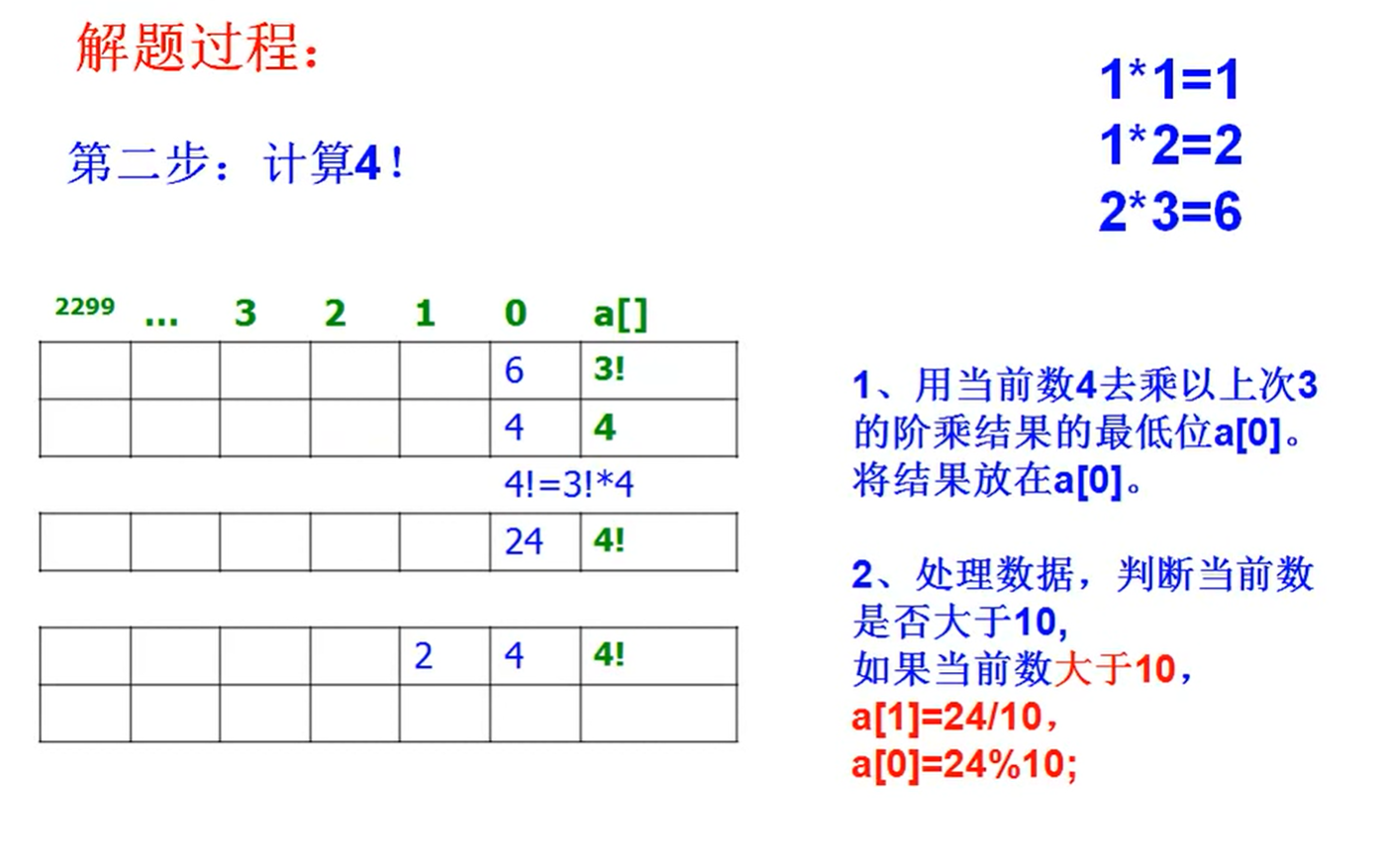 假设已经计算出3的阶乘的每一位的数值的数组了,现在要计算4的阶乘,