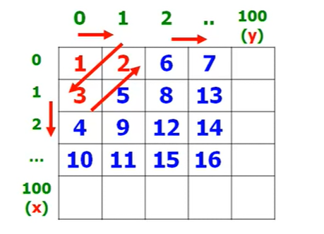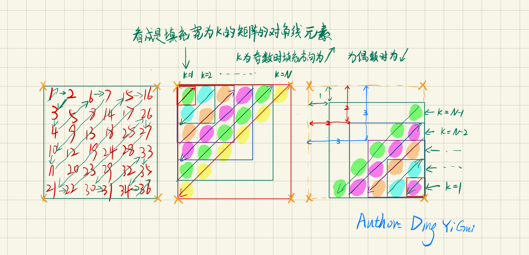 对于左上角的数字,看成是填充矩阵的对角线,矩阵的宽分别为1,2,3,....N;